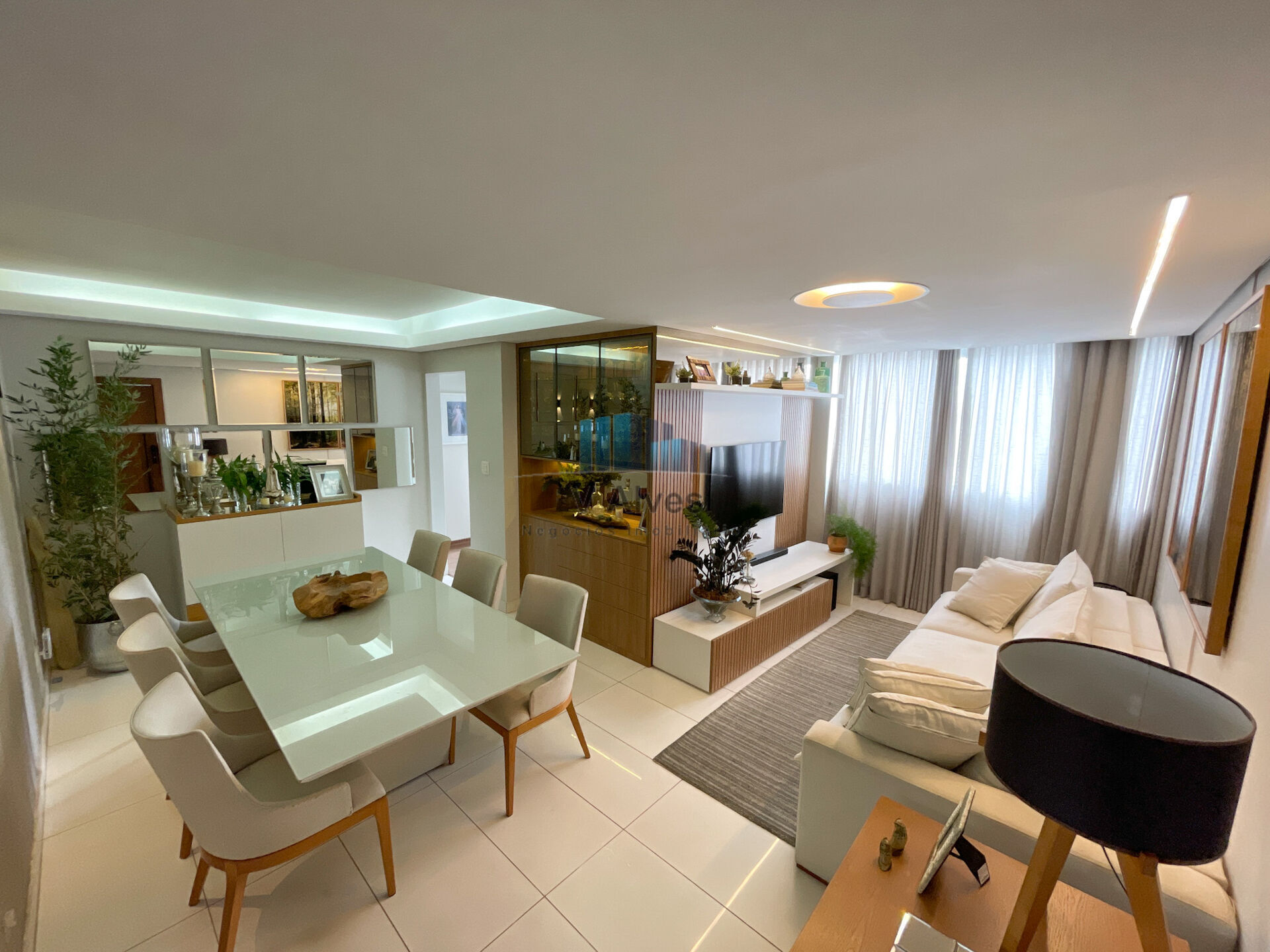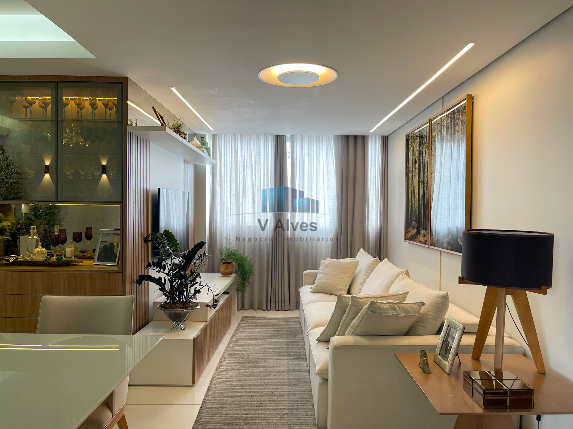 - Sala espaçosa para dois ambientes, com iluminação planejada, cristaleira e rebaixamento em gesso;